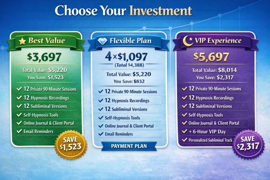 ✔️ 12 private 90-minute hypnosis sessions (valued at $4,164)